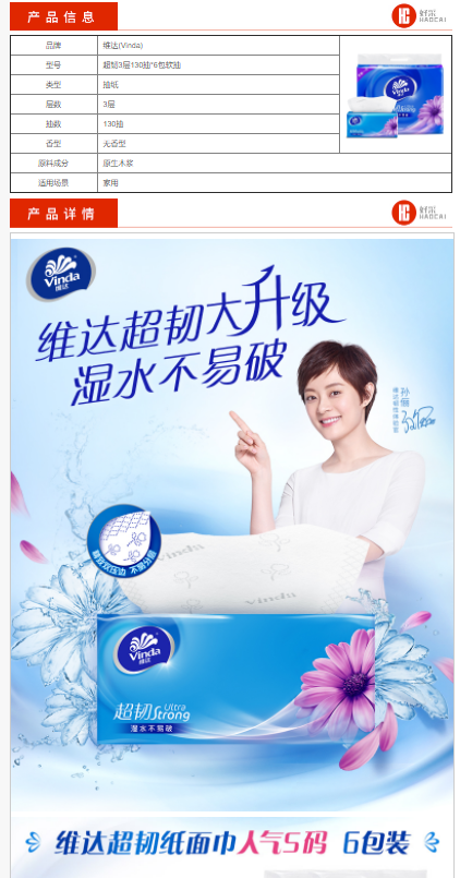 - 商品名称:维达(Vinda) 超韧3层130抽*6包软抽 抽纸纸巾 (真S码)(单位:提)