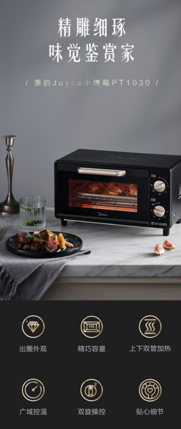 商品名称:美的(Midea)PT1030 电烤箱 多功能家用 迷你小烤箱 电烤箱蛋糕烘焙10升容量 商品编号:194022 品牌:美的 上架时间:2022-07-05 商品毛重:0克