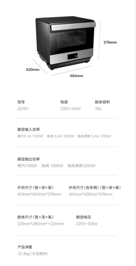 商品名称:松下(Panasonic )电烤箱 京东小家智能生态蒸烤箱 家用电烤箱 蒸烤炸一体机多功能家用电烤箱 NU-JD181BXPE 商品编号:194028 品牌:松下 上架时间:2022-07-05 商品毛重:0克