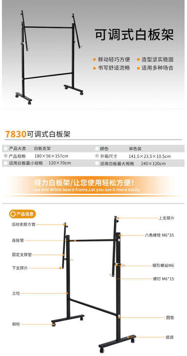 商品名称:得力(deli)7830白板系列 白板支架 悬挂式磁性大白板写字教学办公会议板 标准稳固白板架(黑色) 商品编号:194488 品牌:得力 上架时间:2022-07-18 商品毛重:0克