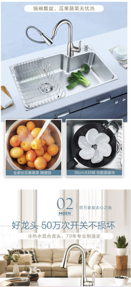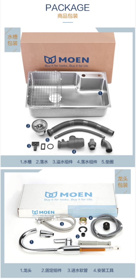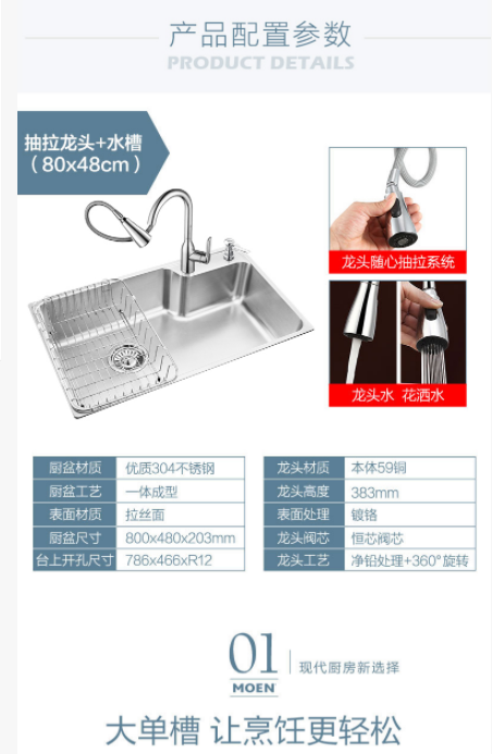 商品名称:摩恩(MOEN )304不锈钢水槽套装 厨房大单槽 800mm厨用洗菜盆水池台上台下盆29018配抽拉式厨房龙头 商品编号:194953 品牌:摩恩 上架时间:2022-08-02 商品毛重:0克