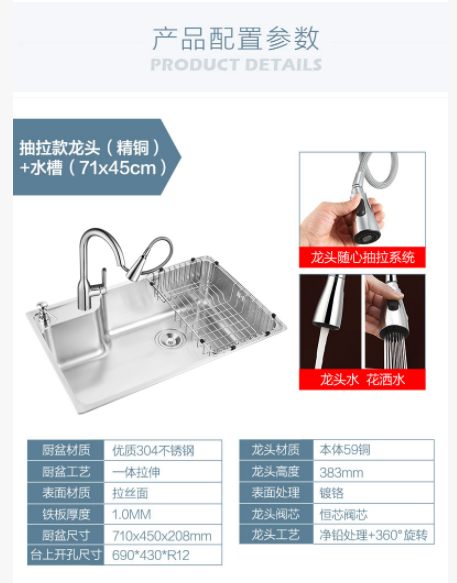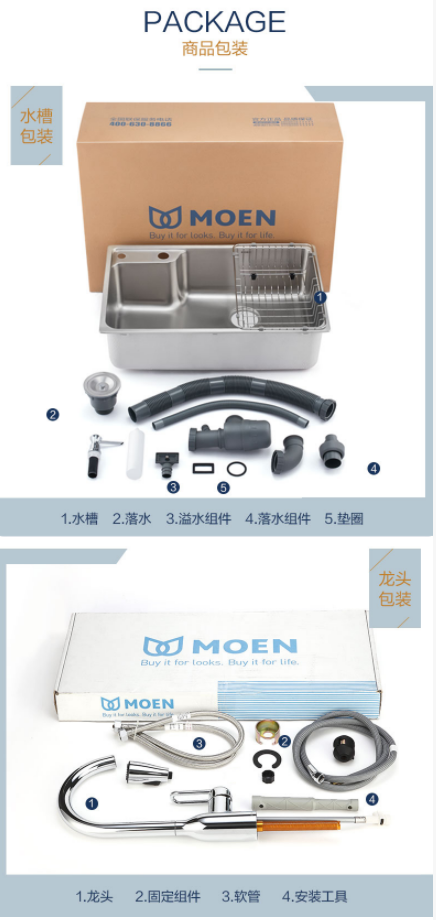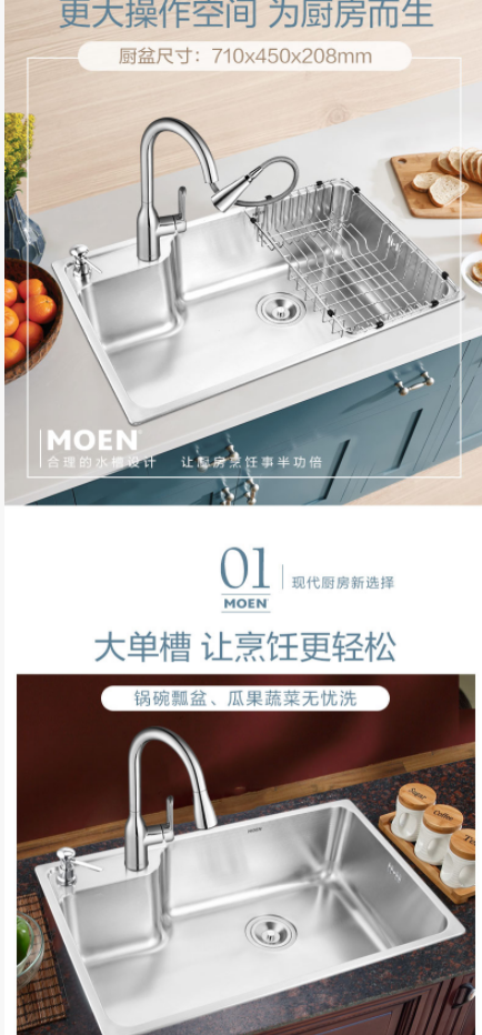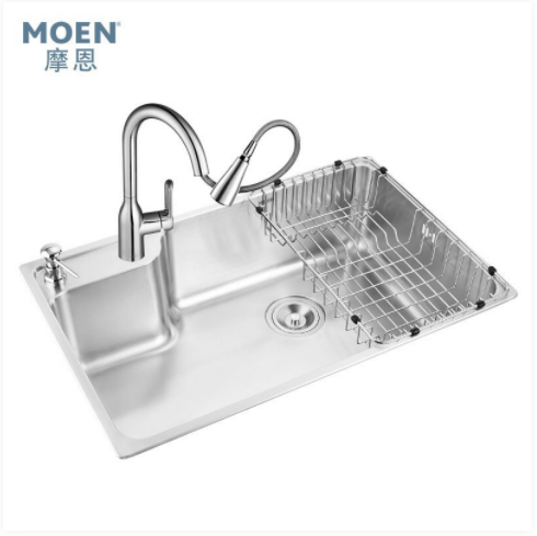 商品名称:摩恩(MOEN)304不锈钢水槽套装 710mm大单槽 厨房水池洗菜盆 精铜抽拉龙头厨房龙头 商品编号:194973 品牌:摩恩 上架时间:2022-08-02 商品毛重:0克