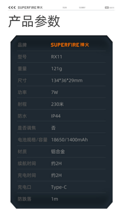 商品名称:神火(supfire)RX11手电筒强光手电Type-C充电多功能家用便携小型户外骑行停电照明应急灯 商品编号:195613 品牌:神火 上架时间:2022-08-25 商品毛重:0克