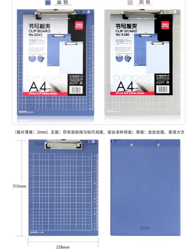 商品名称:得力(deli)板夹A4 9240 适用A4纸 灰色 商品编号:195814 品牌:得力 上架时间:2022-09-07 商品毛重:0克