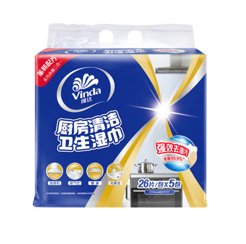 商品名称:维达(Vinda) 湿巾/厨房用纸 26片装*5包厨房湿巾 一片轻松去油污 吸油纸 厨房纸 商品编号:198066 品牌:维达 上架时间:2022-11-16 商品毛重:0克