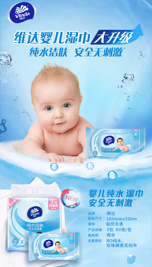 商品名称:维达(Vinda) 湿巾 婴儿湿巾80片*3包 带盖保湿装 纯水湿巾洁肤 卫生清洁 安全无刺激 婴儿湿纸巾 商品编号:198090 品牌:维达 上架时间:2022-11-16 商品毛重:0克