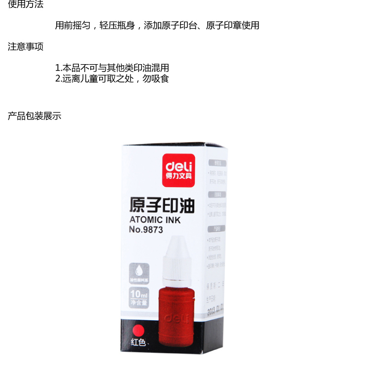商品名称:得力(deli)9873原子印油 快干印油 得力印油 蓝色 商品编号:1594400427 品牌:得力 上架时间: 商品毛重:0克