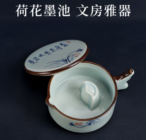 天天练(Tiantianlian)荷花墨池 带盖砚台墨海陶瓷水洗笔掭墨碟文房四宝 TN-1838