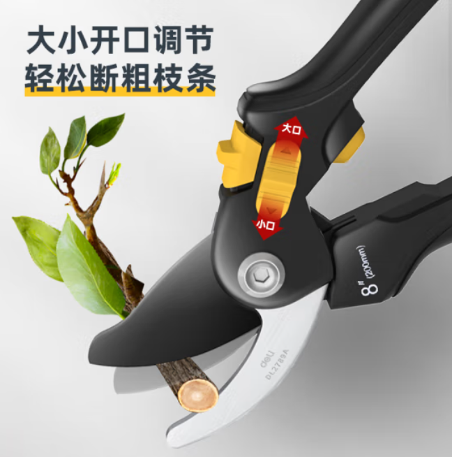 商品名称:得力(deli) 省力果枝剪园林园艺剪树枝剪家用修枝剪枝修花剪刀开口可调节16mm DL2789A 商品编号:198648 品牌:得力 上架时间:2022-12-07 商品毛重:0克