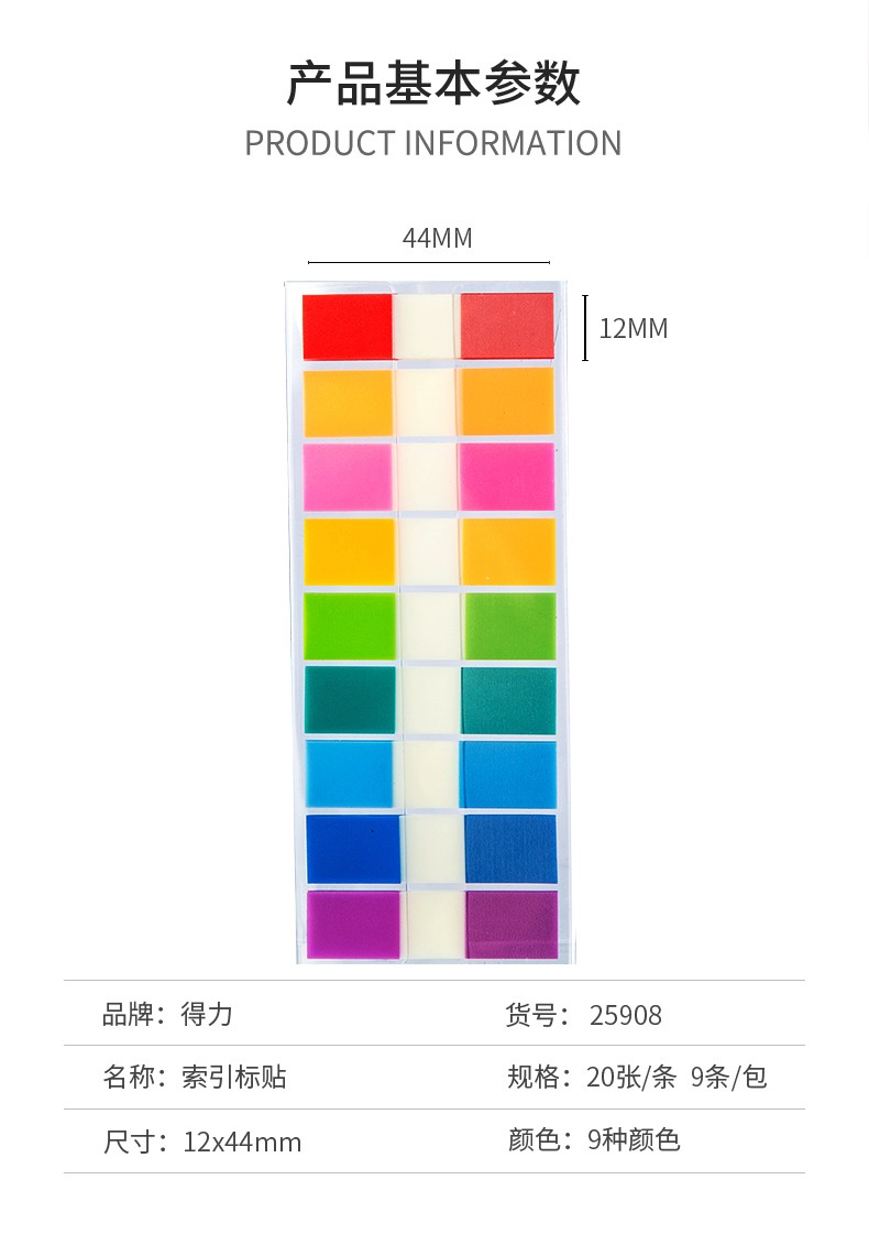 商品名称:得力(deli)25906简约便签纸便利贴 便签本 记事贴 12*44mm 180张/包 25908 商品编号:61464285274 品牌:得力 上架时间: 商品毛重:0克