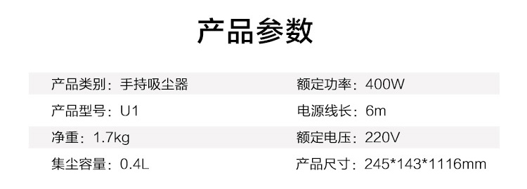 商品名称:美的(Midea)吸尘器U1家用手持立式吸尘器二合一强劲吸力 商品编号:199000 品牌:美的 上架时间:2023-02-02 商品毛重:0克