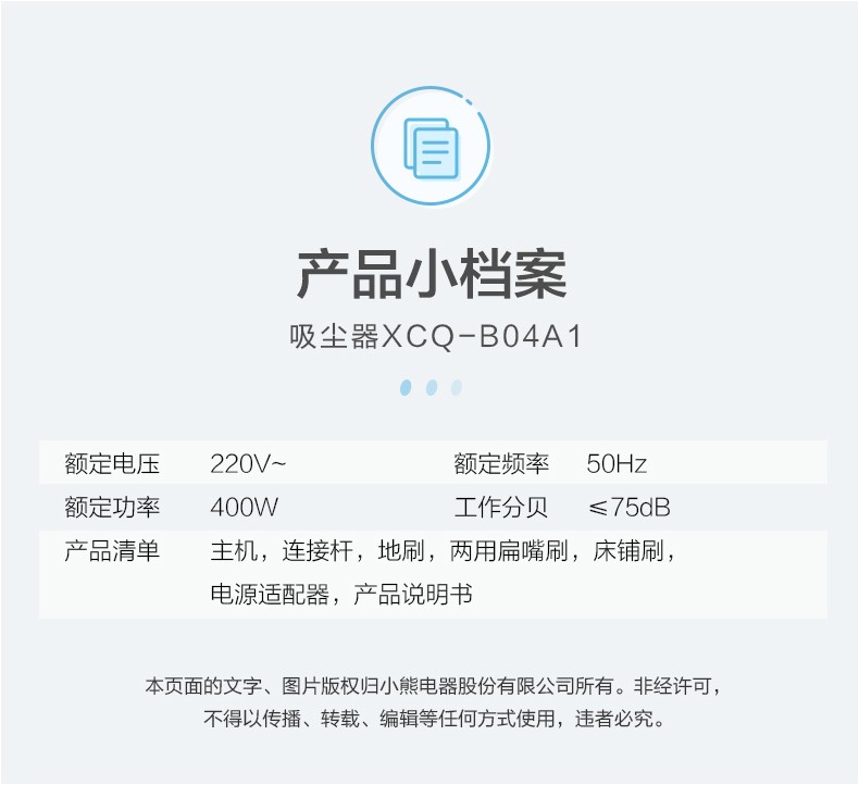 商品名称:小熊(Bear) 吸尘器 手持大吸力吸尘机 大功率沙发吸尘 XCQ-B01A2高效除尘+三种刷头配置 商品编号:199010 品牌:小熊 上架时间:2023-02-06 商品毛重:0克