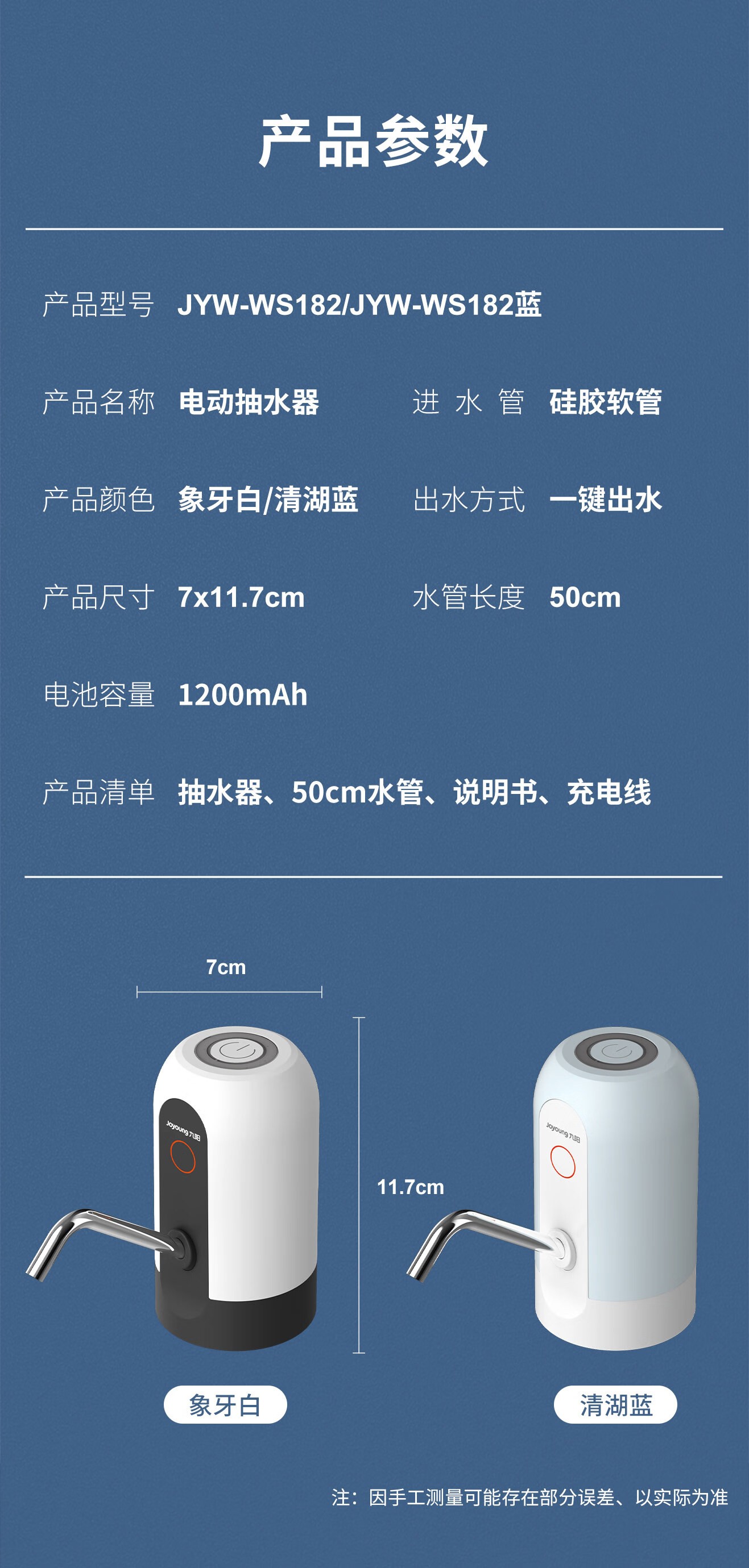 商品名称:九阳(Joyoung)桶装水纯净水桶抽水器饮水机泵电动压水器吸水器家用上水器JYW-WS182蓝