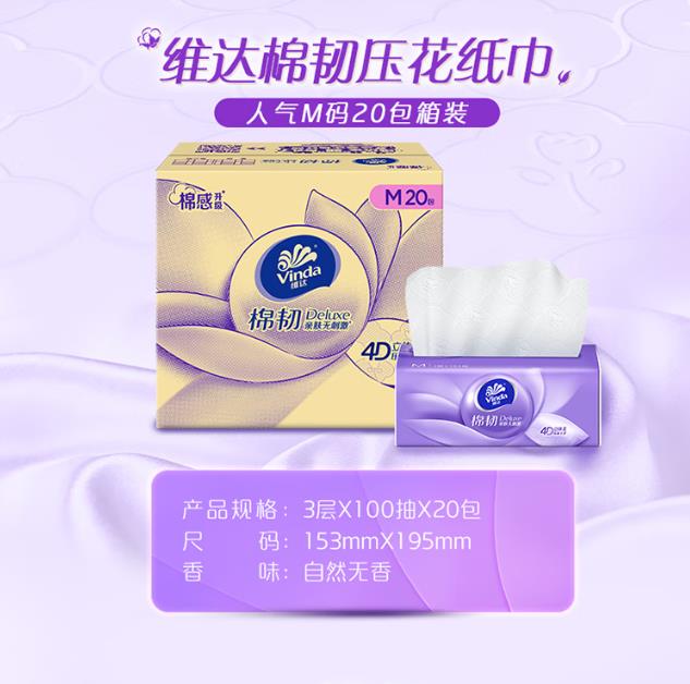 商品名称:维达(Vinda)抽纸 棉韧100抽*20包M码 亲肤无刺激 卫生纸 纸巾 餐巾纸 整箱 商品编号:203483 品牌:维达 上架时间:2023-04-04 商品毛重:0克