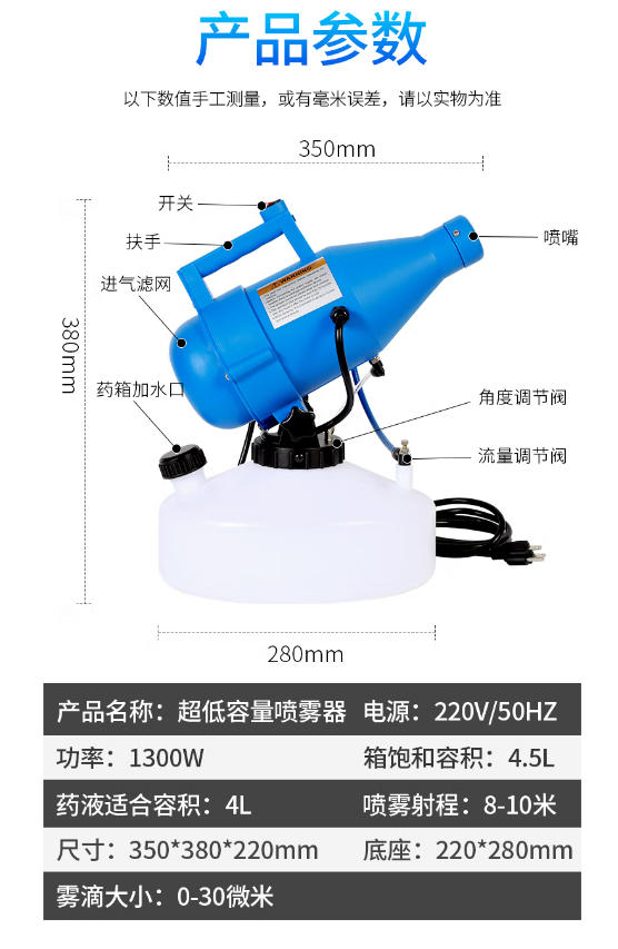 商品名称:农宝 超低容量喷雾器锂电池气溶胶电动消杀室内消毒杀菌弥雾机手提式雾化机喷洒机10米电源线款 商品编号:203904 品牌:农宝 上架时间:2023-04-11 商品毛重:0克