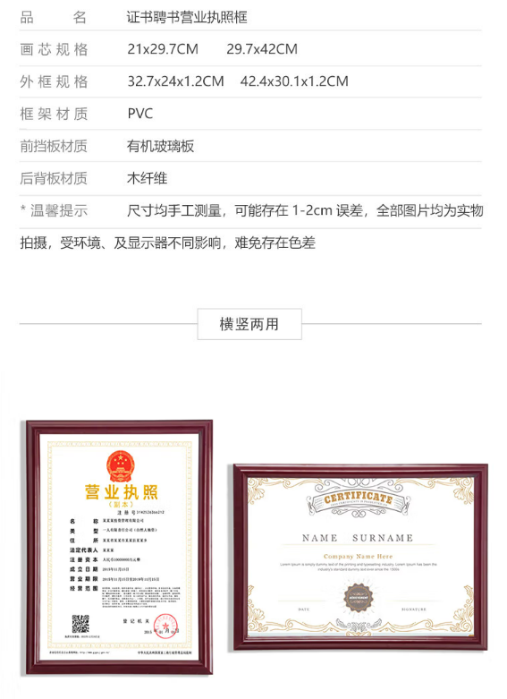 商品名称:FOOJO富居 A3营业执照正本框相框挂墙 仿木卫生许可证件框架 荣誉证书奖状框画框装裱 红木色 商品编号:204442 品牌:富居 上架时间:2023-04-20 商品毛重:0克