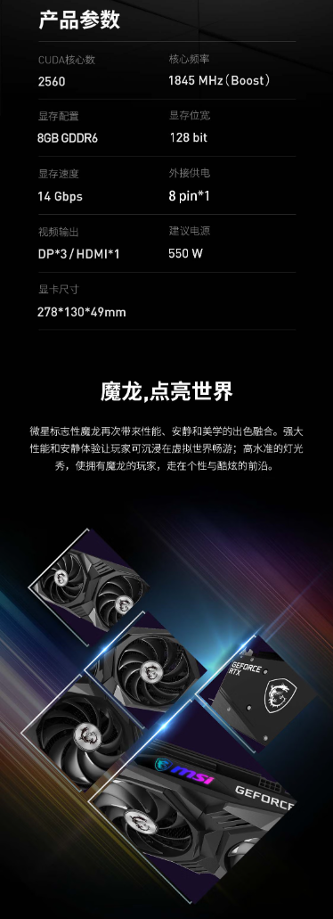 商品名称:微星(MSI)魔龙 GeForce RTX 3050 GAMING X 8G 超频版 旗舰款 电竞游戏设计专业电脑显卡 商品编号:204843 品牌:微星 上架时间:2023-04-25 商品毛重:0克