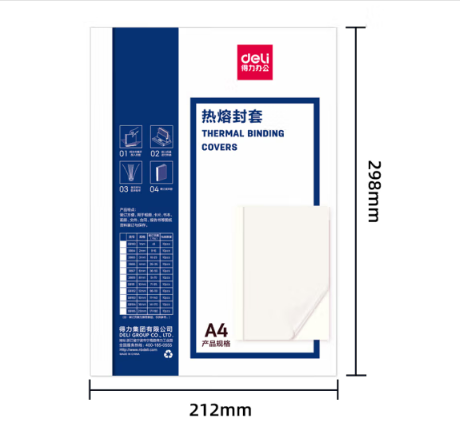 商品名称:得力(deli)GB181 热熔封套 热熔装订机专用装订封皮 A4/10mm(10个装) 商品编号:206457 品牌:得力 上架时间:2023-06-28 商品毛重:0克