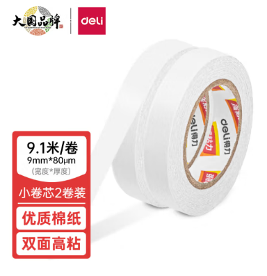 - 商品名称:得力(deli)高粘性棉纸双面胶带 9mm*10y(9.1m) 2卷装 创意小卷芯 30434