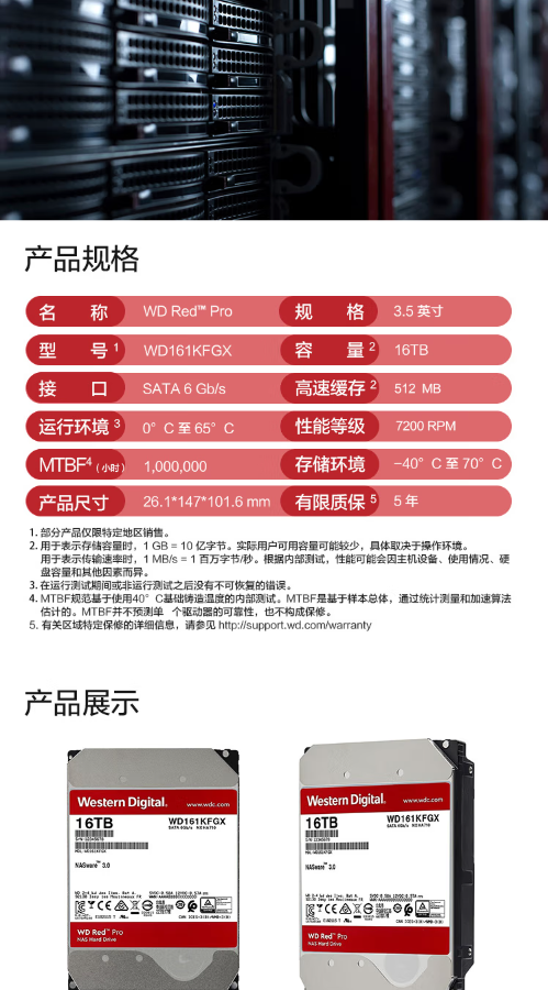 - 商品名称:西部数据 NAS硬盘 WD Red Pro 西数红盘Pro 16TB 7200转 512MB SATA CMR (WD161KFGX)