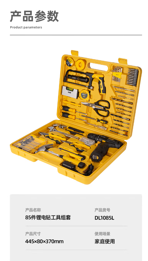 商品名称:得力(deli)85件套居家锂电钻工具箱套装物业检修工具 DL1085L 商品编号:207012 品牌:得力 上架时间:2023-07-06 商品毛重:0克