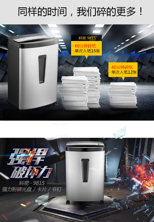 商品名称:科密 9815 五级密保(单次15张 持续60分钟 33L 可碎卡、光盘)碎纸机 商品编号:208549 品牌:科密 上架时间:2023-08-01 商品毛重:0克