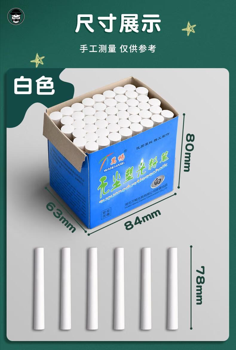 商品名称:万畅 无尘粉笔 量贩装白色50盒/一箱 商品编号:209742 品牌:万畅 上架时间:2023-09-18 商品毛重:0克