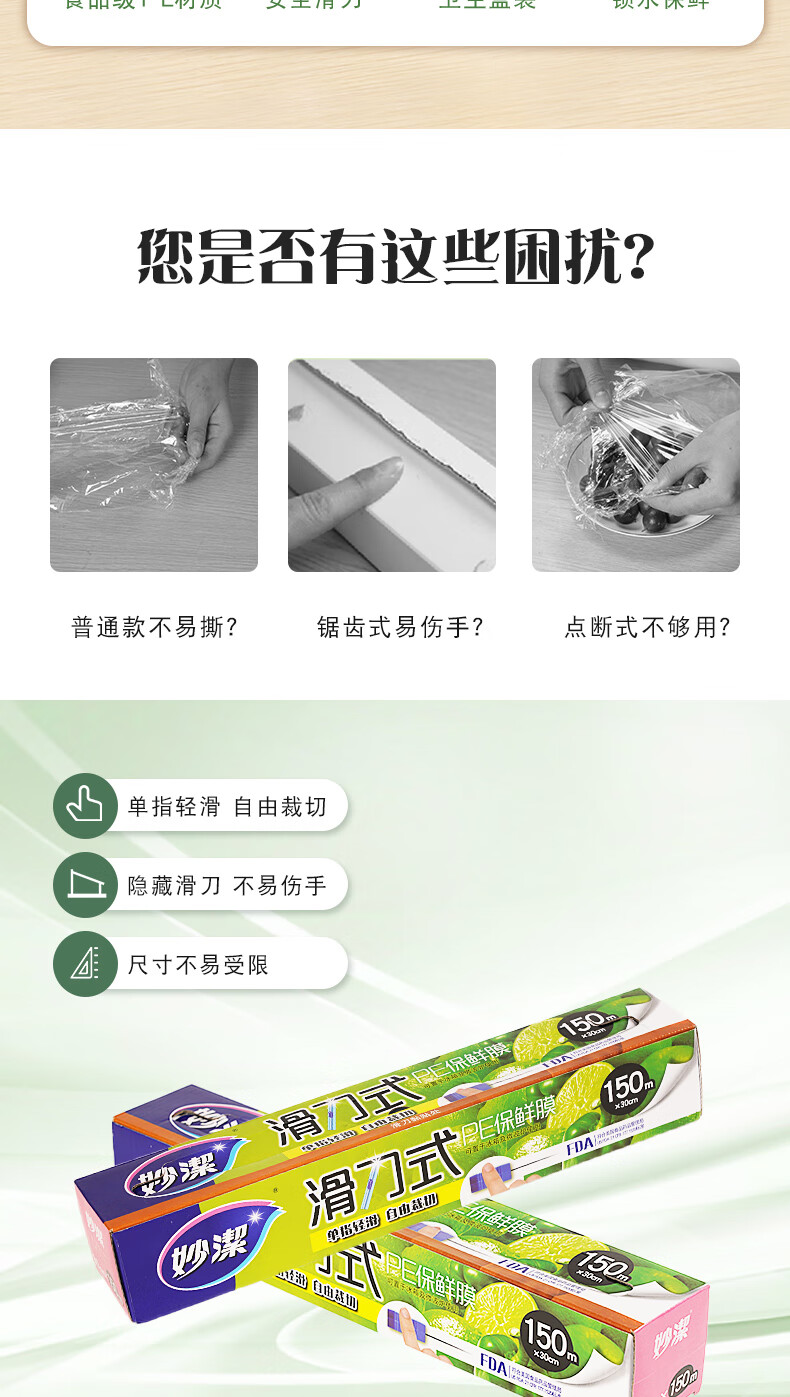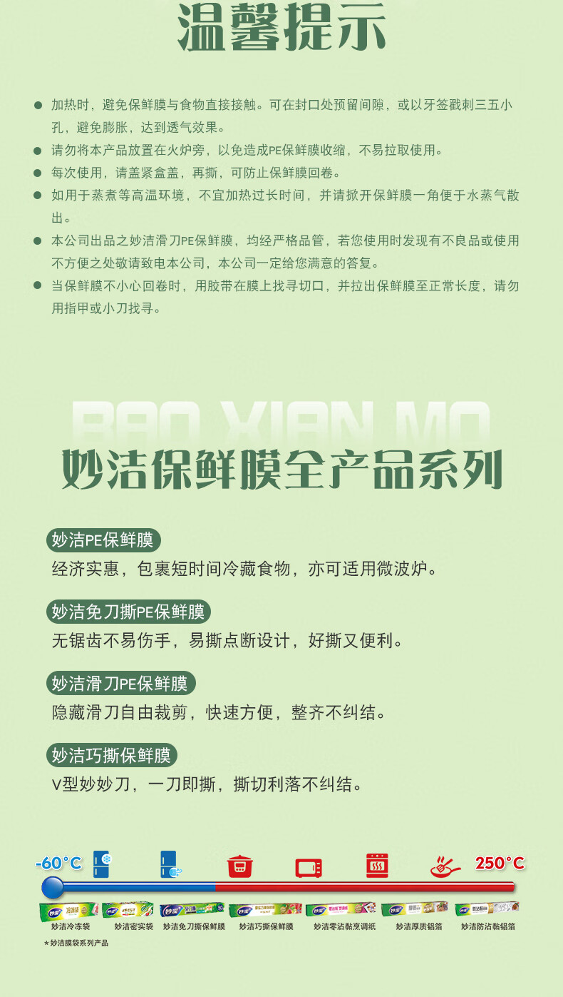 商品名称:妙洁 滑刀保鲜膜 大碗150米 商品编号:209748 品牌:妙洁 上架时间:2023-09-18 商品毛重:0克