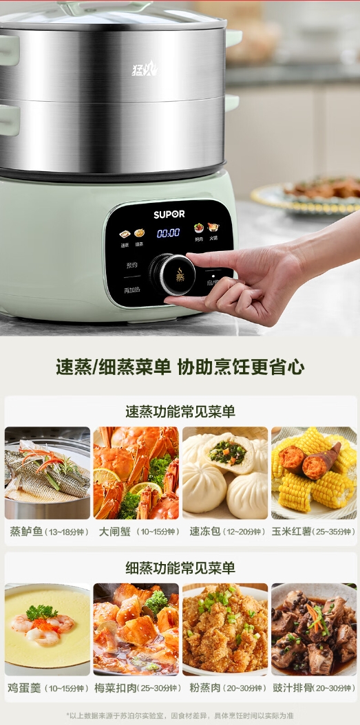 商品名称:苏泊尔(SUPOR)电蒸锅不锈钢蒸锅蒸箱家用多功能锅三层15L大容量炖蒸煮一体电火锅煮蛋器电煮锅电炖锅 绿色 商品编号:210231 品牌:苏泊尔 上架时间:2023-10-11 商品毛重:0克