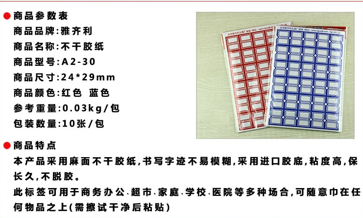 商品名称:雅齐利口曲纸口取纸小号标签红蓝色财务用不干胶贴 C3-10红色 10张/包 商品编号:211036 品牌:雅齐利 上架时间:2023-11-02 商品毛重:0克
