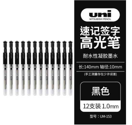 - 商品名称:三菱(Uni)耐水速记中性笔高光笔1.0mm签字笔UM-153黑色 12支装