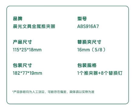 商品名称:晨光(M&G)ABS916A7 金属推夹器 单卡装 商品编号:212052 品牌:晨光 上架时间:2023-11-28 商品毛重:0克