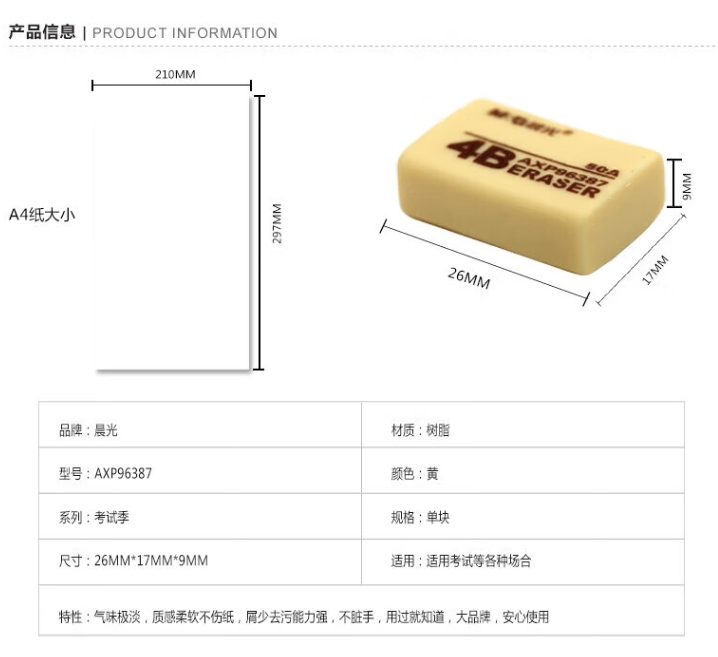 商品名称:晨光(M&G)AXP96387 4B 橡皮擦 1块装 商品编号:212125 品牌:晨光 上架时间:2023-11-28 商品毛重:0克