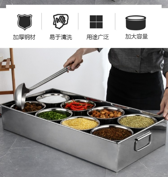 商品名称:国标 商用不锈钢食堂厨房调料盒套装带托盘带盖12cm 商品编号:212811 品牌:国标 上架时间:2023-12-13 商品毛重:0克