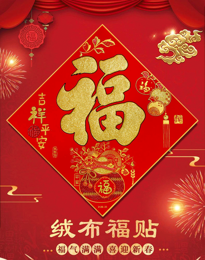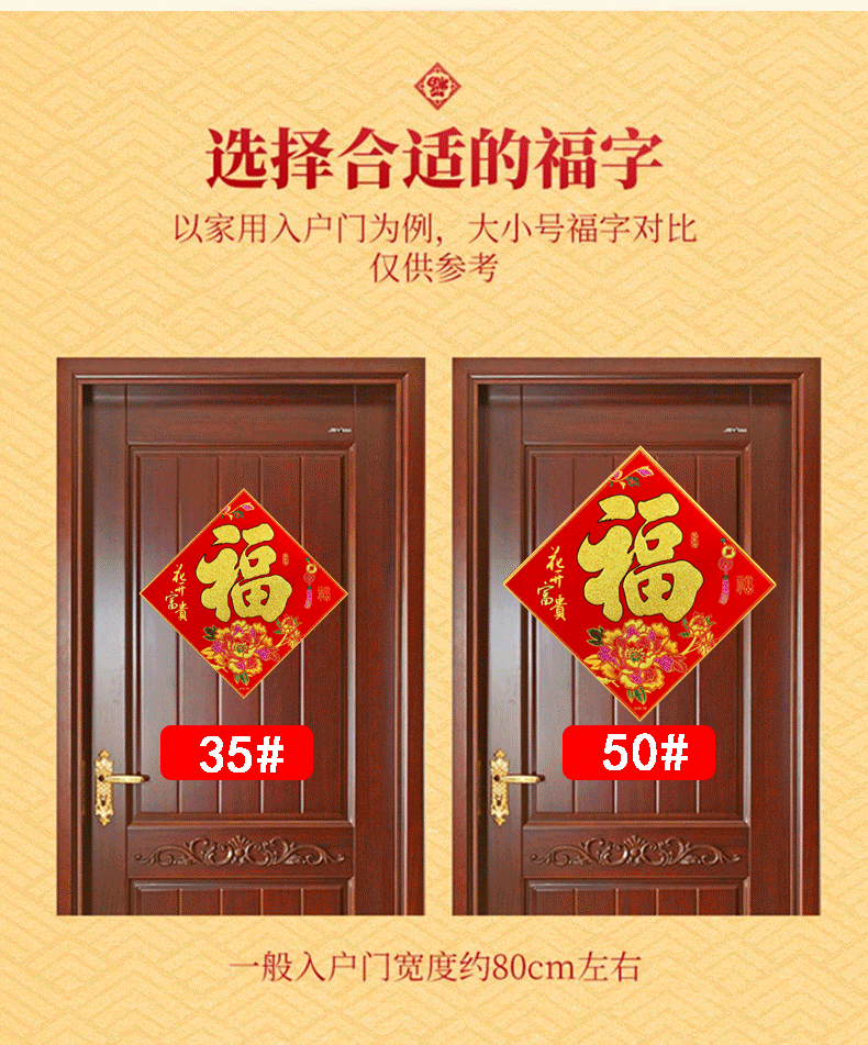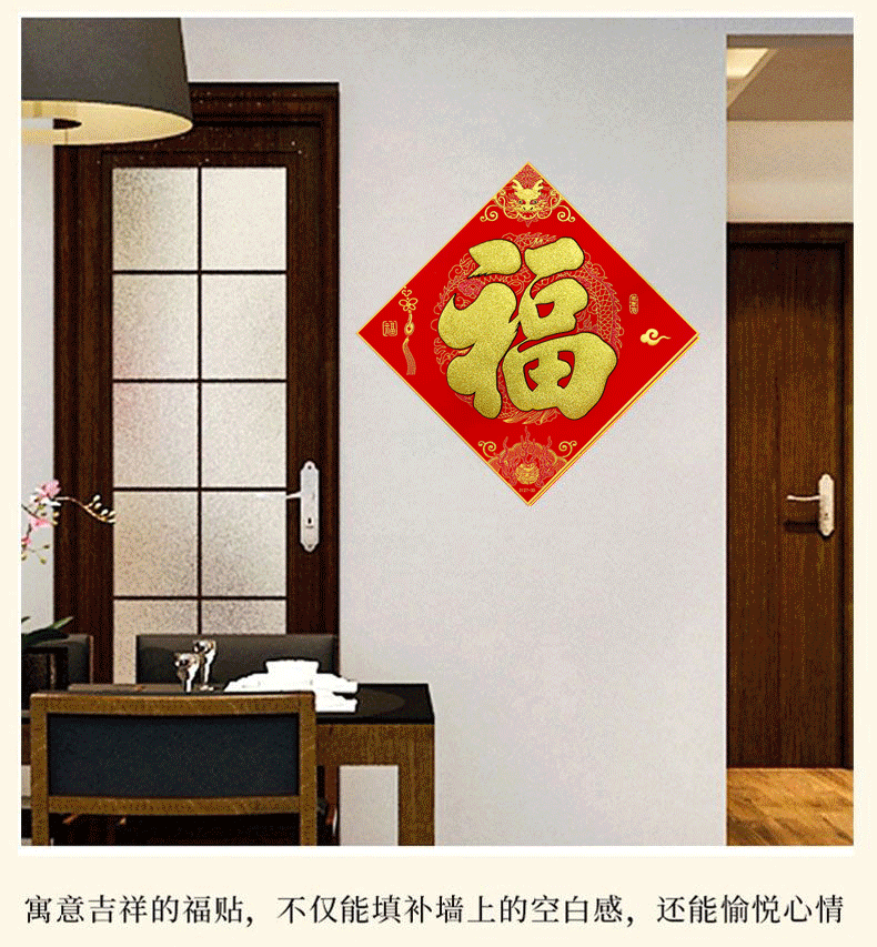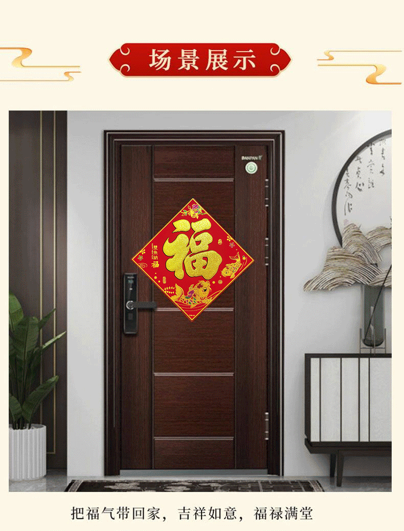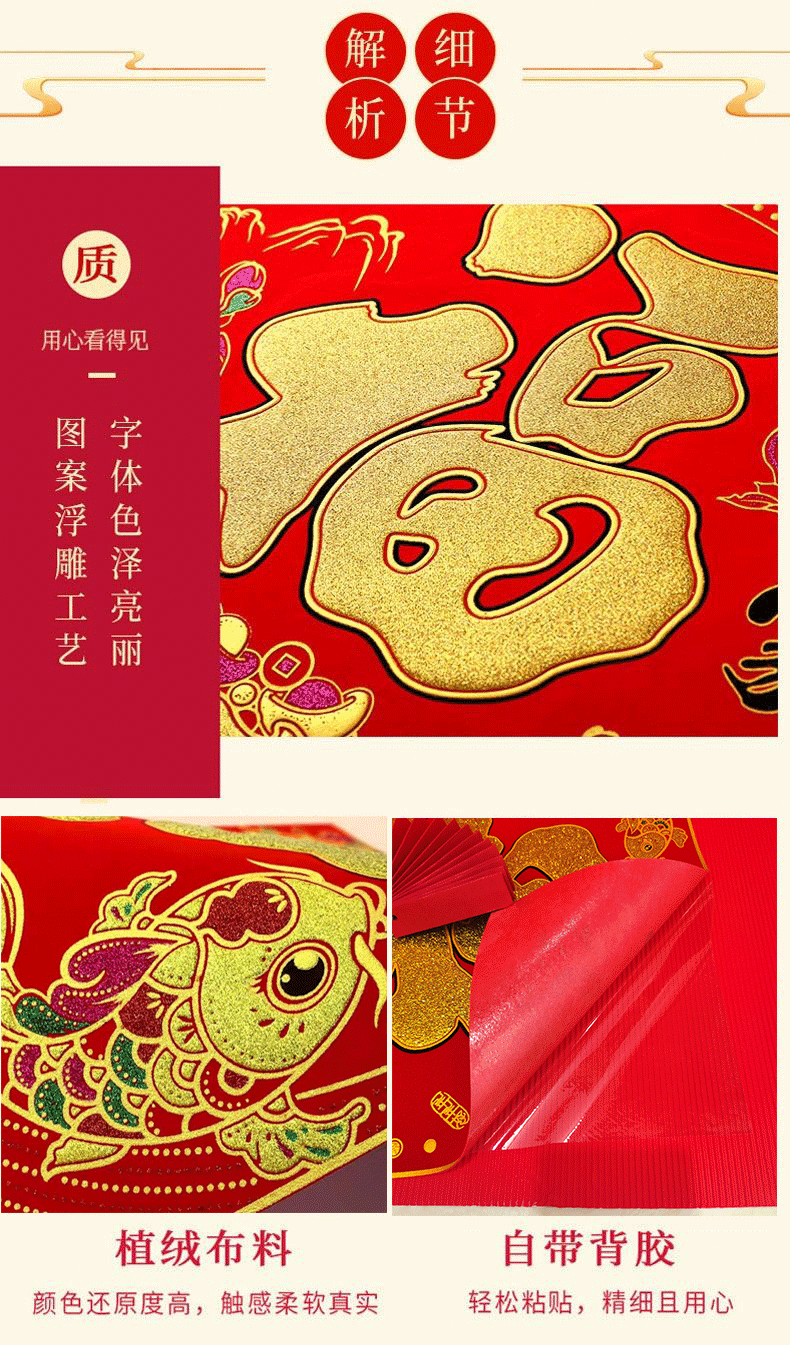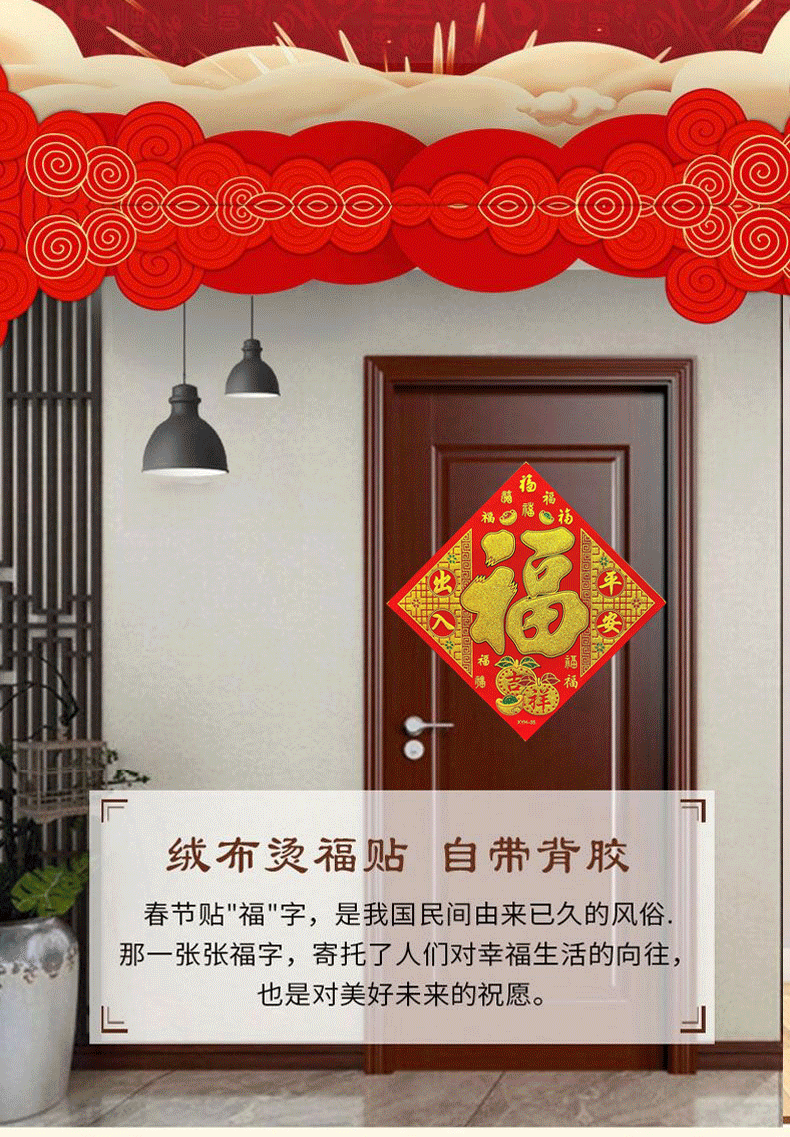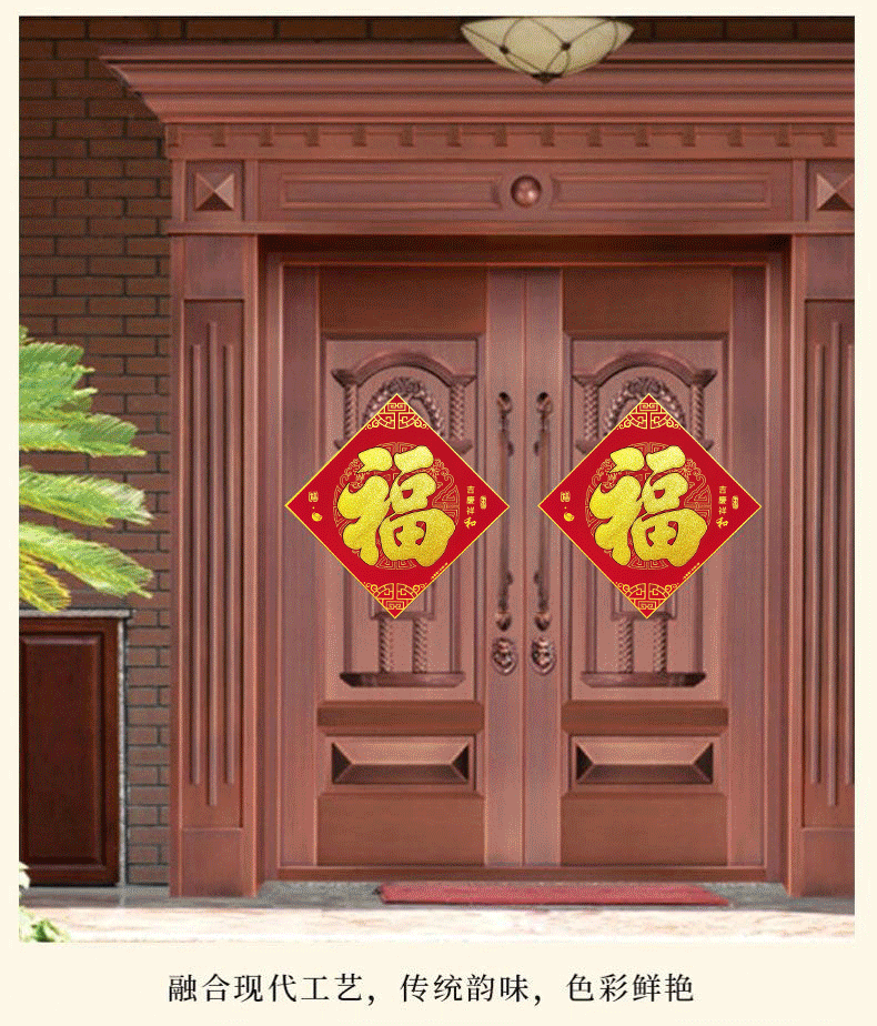 商品名称:溥畔绒布福字门贴新年过年装饰用品春节福字大门自粘贴纸窗花40#(边长38cm,对角线54cm) 商品编号:213423 品牌:溥畔 上架时间:2024-01-25 商品毛重:0克