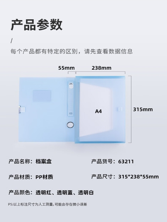 商品名称:得力(deli) A4文件盒塑料档案盒35mm 透明63210 商品编号:213693 品牌:得力 上架时间:2024-02-20 商品毛重:0克
