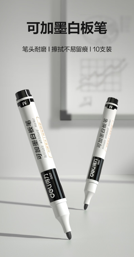 商品名称:得力(deli)可加墨白板笔 可擦易擦 10支黑 办公用品 S507 商品编号:214344 品牌:得力 上架时间:2024-03-13 商品毛重:0克