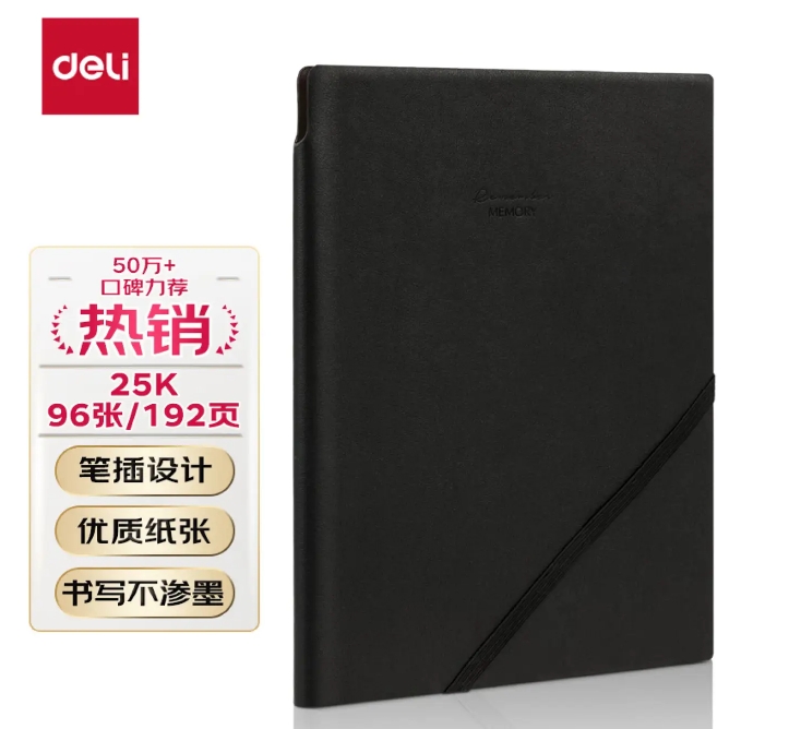 商品名称:得力(deli)25K96张可插笔绑带皮面本 商品编号:214408 品牌:得力 上架时间:2024-03-13 商品毛重:0克