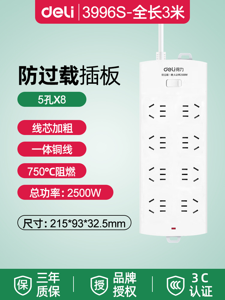 商品名称:得力新国标插座 插排延长线带线插座 3996s 3米8位 商品编号:214484 品牌:得力 上架时间:2024-03-15 商品毛重:0克