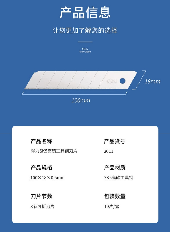 商品名称:得力(deli)8刀头SK5合金钢大号美工刀片 商品编号:214735 品牌:得力 上架时间:2024-03-20 商品毛重:0克