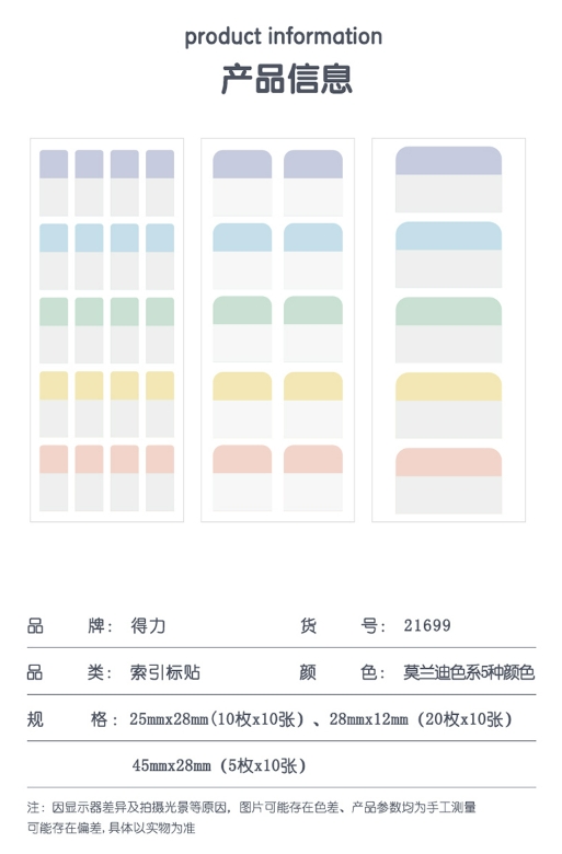 商品名称:得力(deli)350枚多规格索引标签贴半透明指示便签贴条 21699 商品编号:214786 品牌:得力 上架时间:2024-03-20 商品毛重:0克