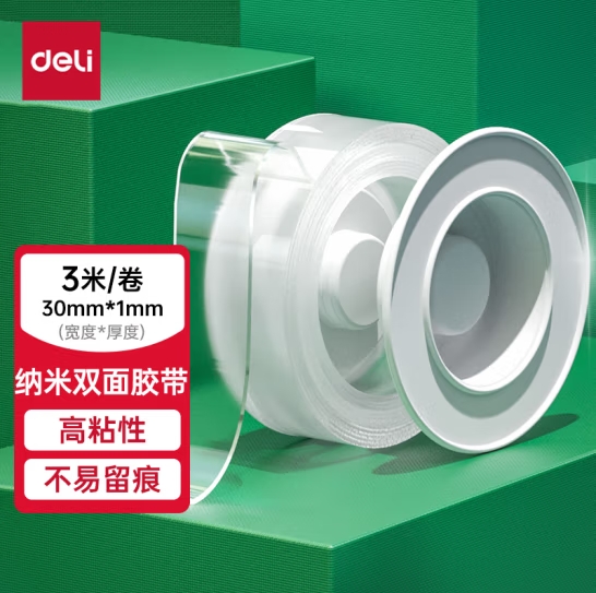 - 商品名称:得力(deli)30mm*3m纳米强力无痕魔力胶带 透明家用车用无痕双面胶 33601