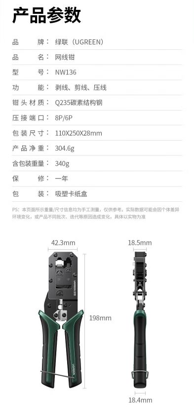 商品名称:绿联 网线钳 超六类6五类水晶头多功能压线钳子七类八类8P6P电话宽带网络工具制作rj45工程剥线夹 网线钳 商品编号:215371 品牌:绿联 上架时间:2024-04-15 商品毛重:0克