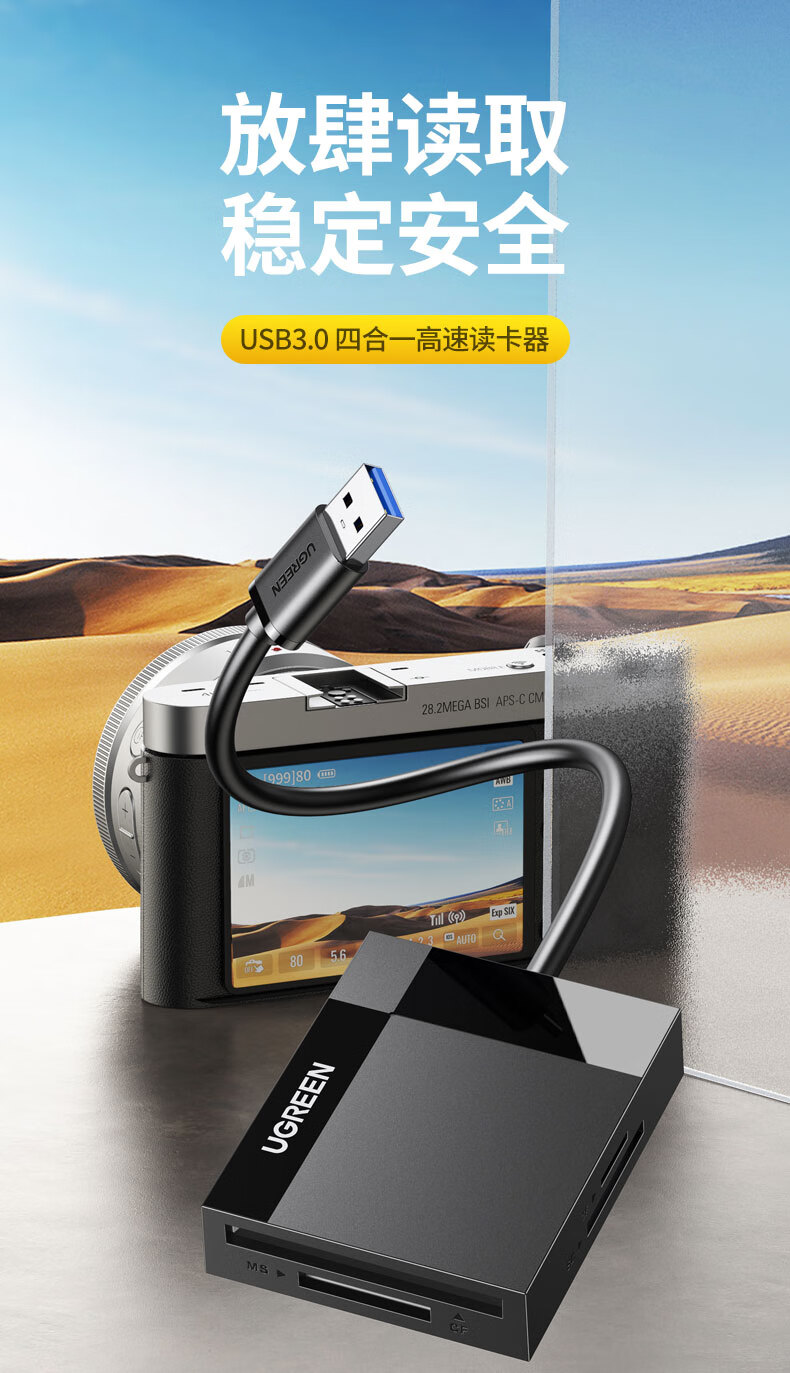 - 商品名称:绿联多合一读卡器USB3.0高速 支持SD/TF/CF/MS型相机无人机记录仪监控存储内存卡 30333多卡多读 线长0.5m