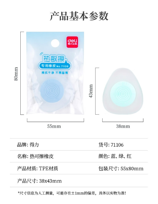 商品名称:得力 热可擦橡皮单块装 颜色随机 71106 商品编号:216119 品牌:得力 上架时间:2024-05-13 商品毛重:0克