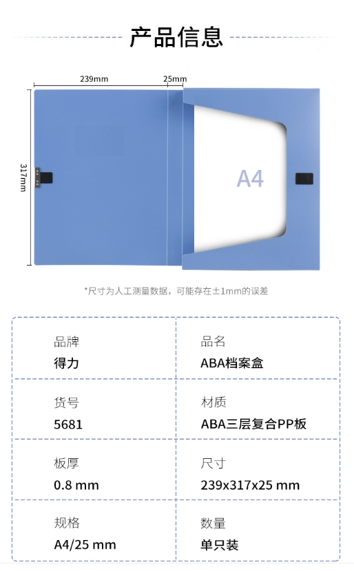 商品名称:得力(deli)A4塑料档案盒25mm 5681 商品编号:217053 品牌:得力 上架时间:2024-06-18 商品毛重:0克
