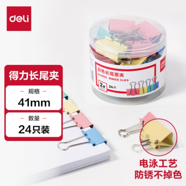 - 商品名称:得力(deli) 8552-2#彩色长尾票夹41mm(筒装)(混)(24只/筒)