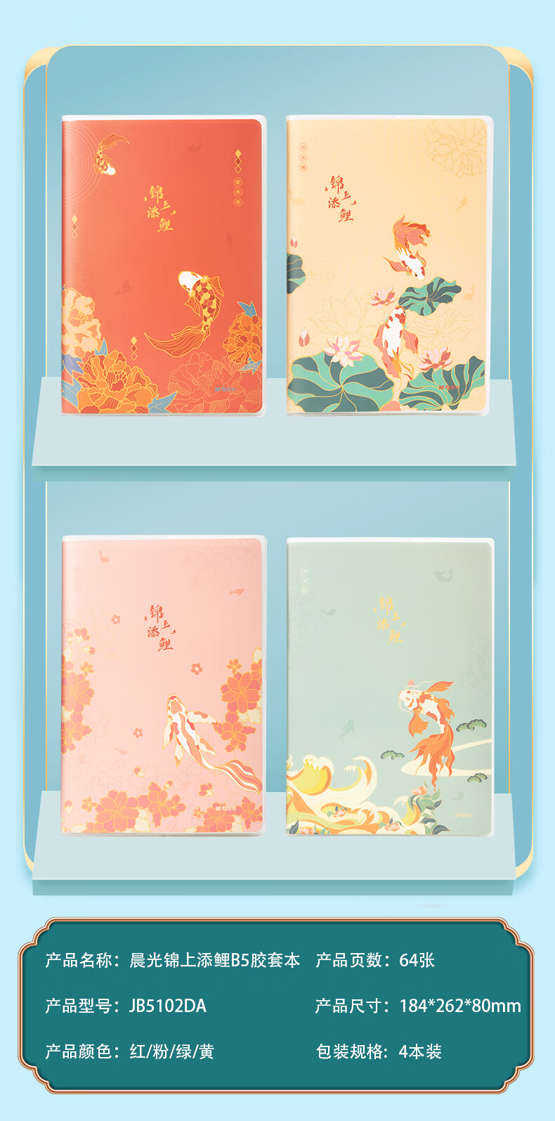 商品名称:晨光(M&G)文具B5胶套本软抄本 64张记事本笔记本子锦上添鲤4本JB5102DA 商品编号:218025 品牌:晨光 上架时间:2024-07-30 商品毛重:0克