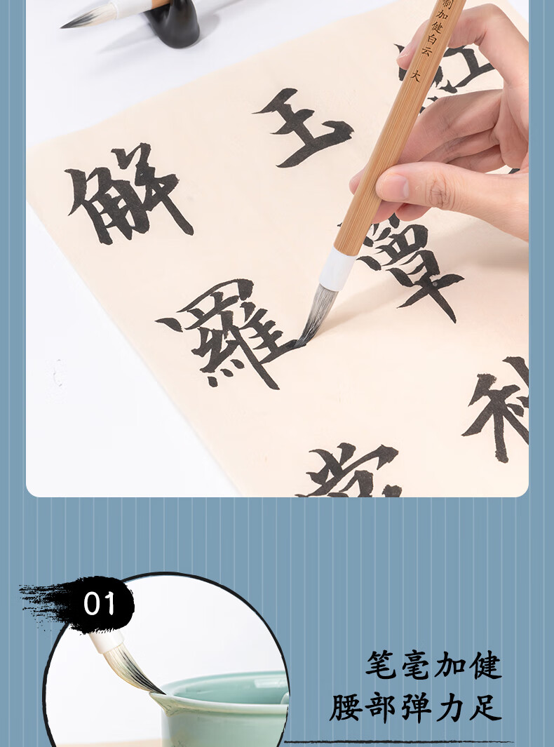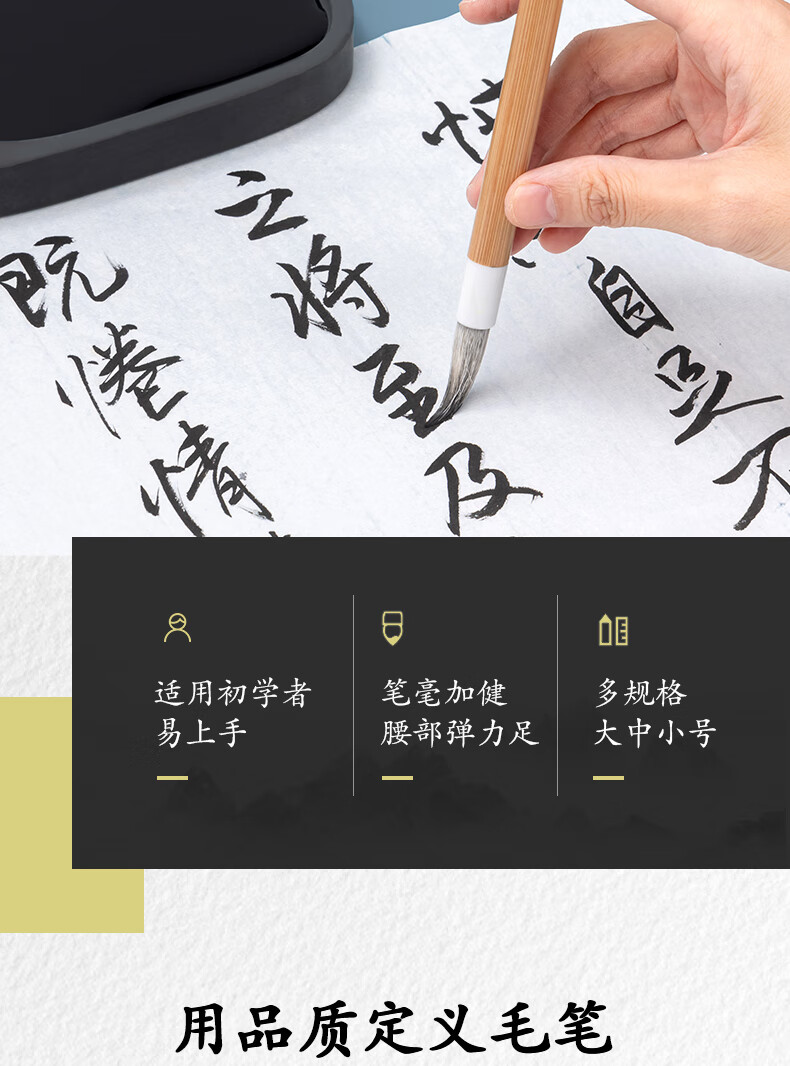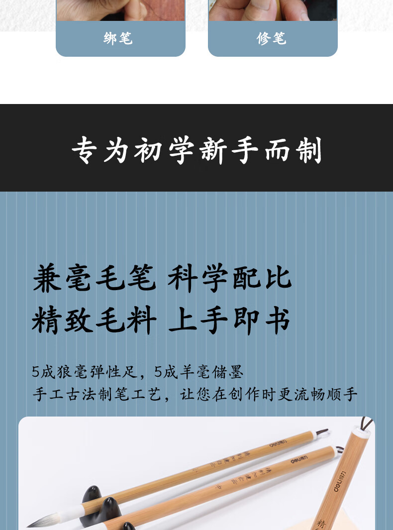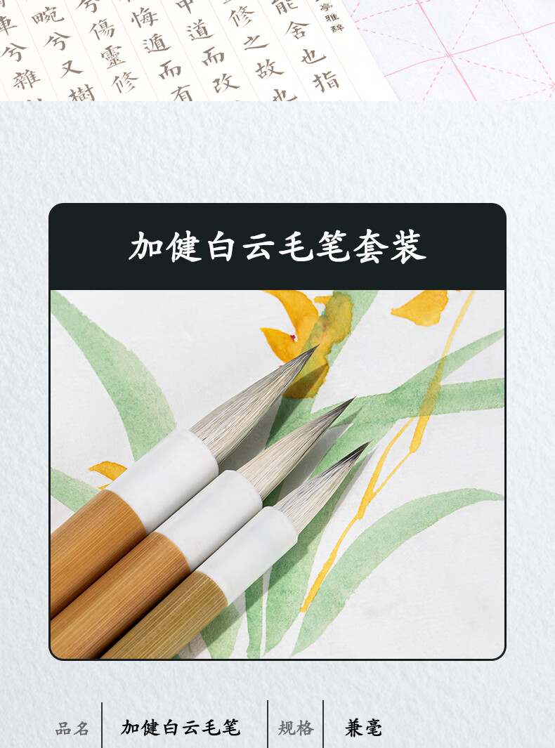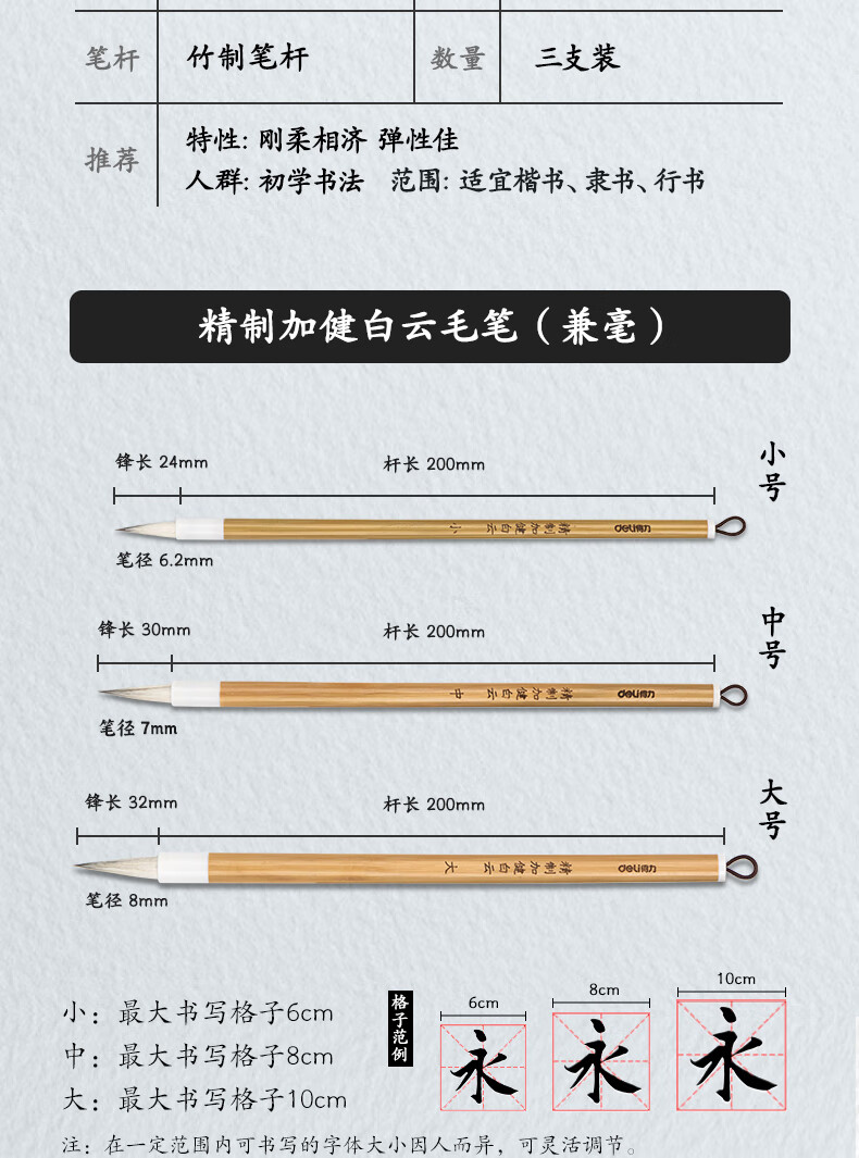 商品名称:得力白云毛笔兼毫加健羊毫入门书法毛笔套装文房四宝大中小号国画笔大楷笔加健中白云HW150-L 商品编号:218281 品牌:得力 上架时间:2024-08-13 商品毛重:0克