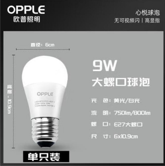 商品名称:欧普照明 led灯泡27螺口 9W 单个装 白光 商品编号:218704 品牌:欧普照明 上架时间:2024-09-03 商品毛重:0克